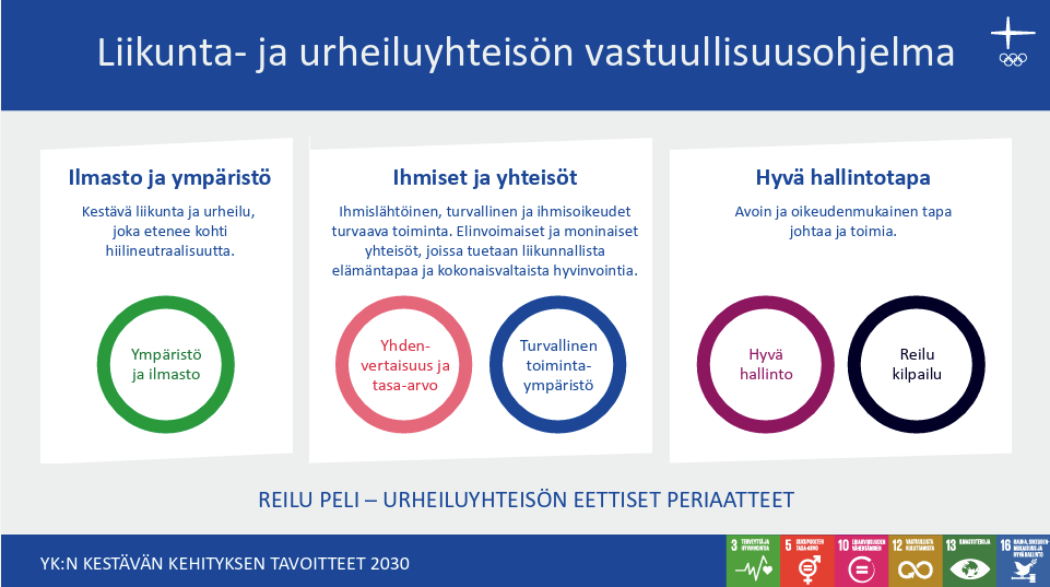 Suomen Nyrkkeilyliitto on sitoutunut urheiluyhteisön yhteiseen vastuullisuusohjelmaan, jonka pohjana ovat Reilu Peli ja urheiluyhteisön eettiset periaatteet (Olympiakomitea 2021).