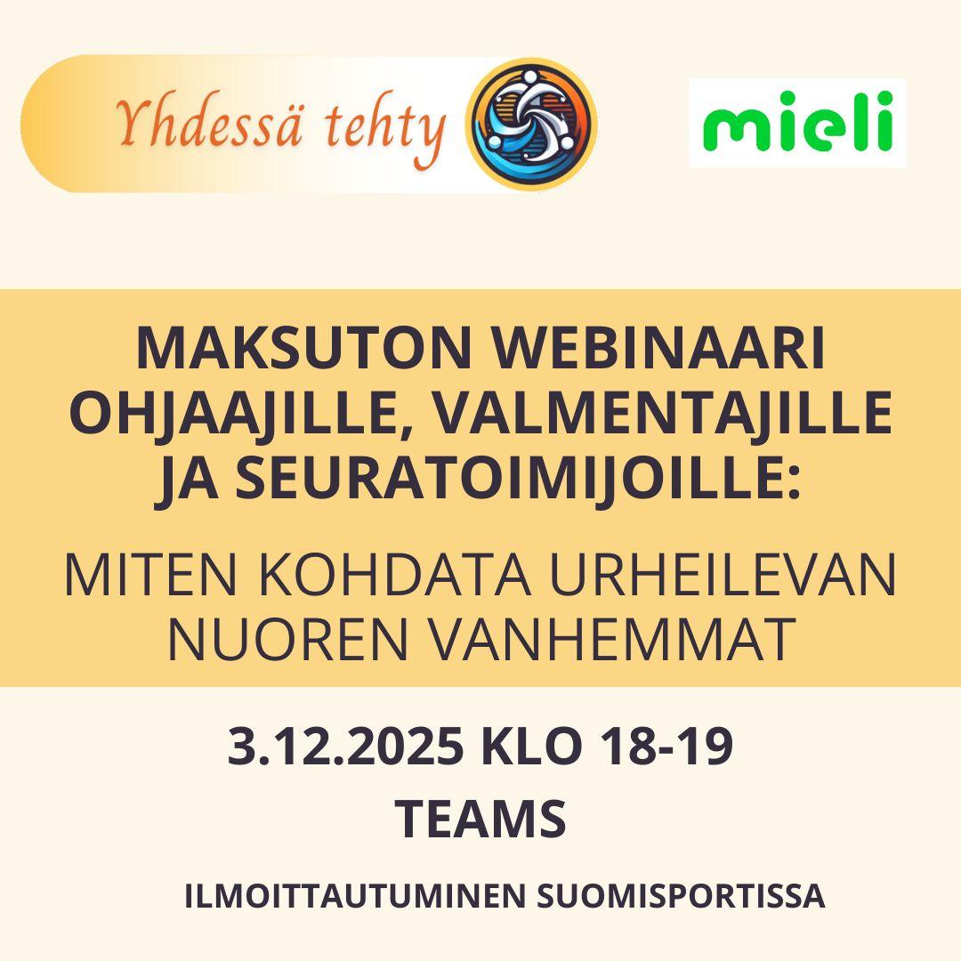Webinaari on suunnattu nuorten urheilijoiden parissa toimiville aikuisille kuten valmentajille, vanhemmille, urheiluseurojen, -oppilaitosten ja -järjestöjen henkilöstölle sekä muille aiheesta kiinnostuneille. Ilmoittautumislinkki >>