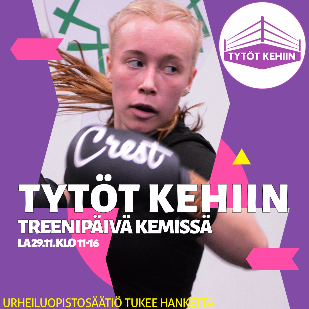 Pohjoisen alueen Tytöt kehiin -nyrkkeilypäivä järjestetään Kemissä. Treenipäivä on avoinna kaikille kilpanyrkkeilyn tytöille ja naisille sekä entisille naiskilpailijoillemme! Lisenssinhaltijoille ihan ilmainen.