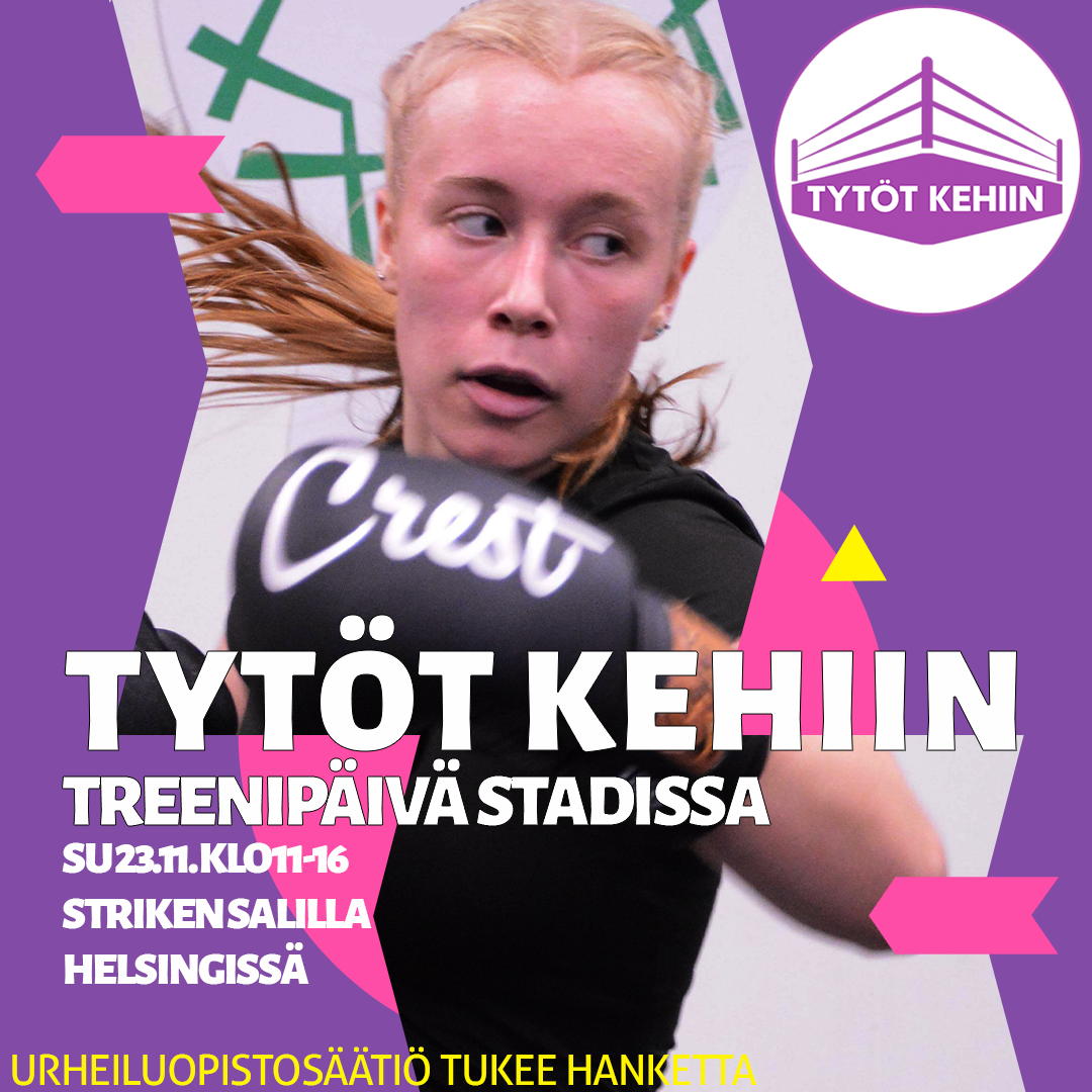 Ihan eka Tytöt kehiin -nyrkkeilypäivä järjestetään Stadissa Striken salilla. Treenipäivä on avoinna kaikille kilpanyrkkeilyn tytöille ja naisille sekä entisille naiskilpailijoillemme! Lisenssinhaltijoille ihan ilmainen.